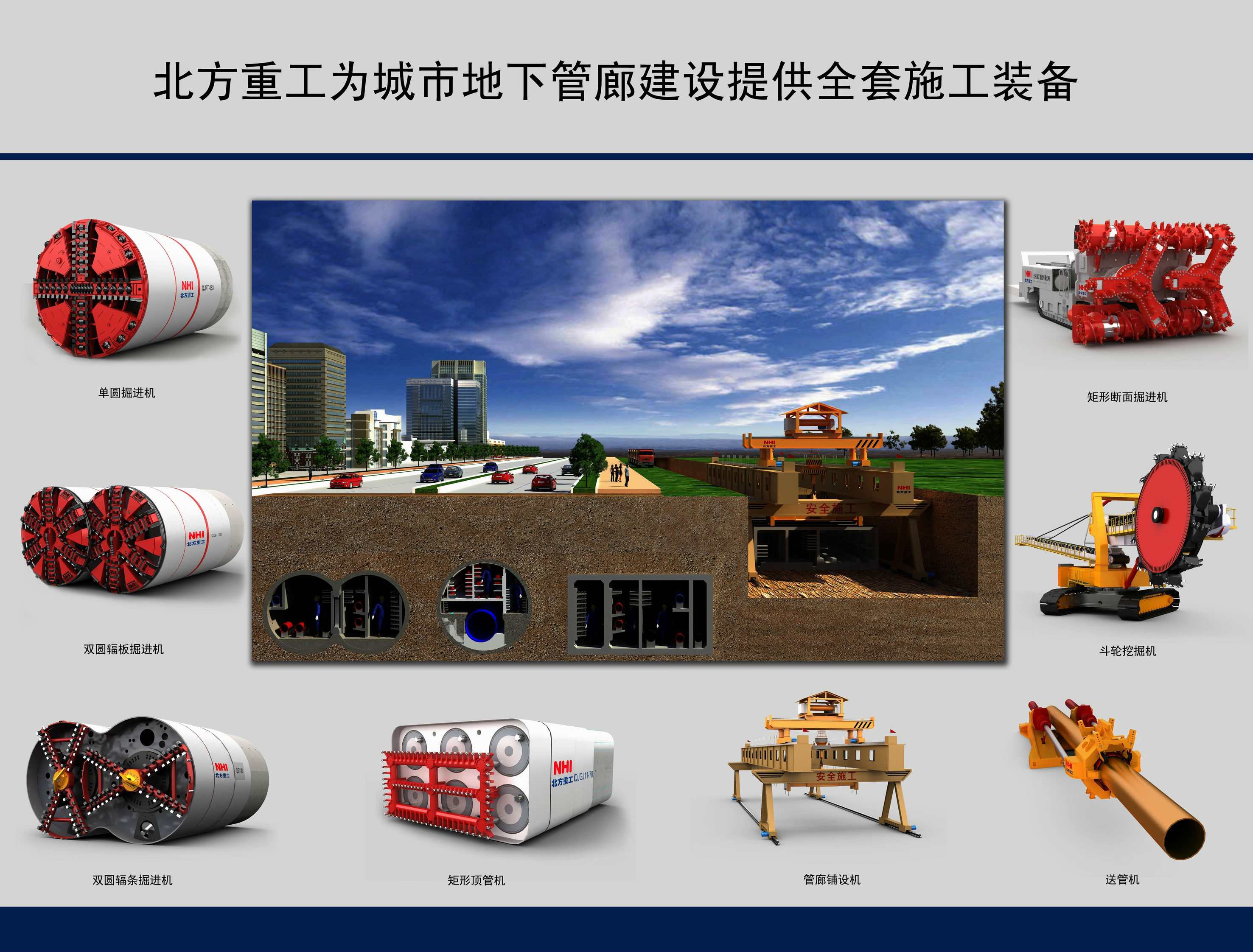 北方重工擁有全套管廊建設(shè)施工裝備解決方案,技術(shù)全面,設(shè)備精良。明挖設(shè)備有矩形斷面掘進(jìn)機和斗輪挖掘機。暗挖設(shè)備有單圓掘進(jìn)機、雙圓掘進(jìn)機和矩形頂管機。明挖輔助設(shè)備有送管機和管廊鋪設(shè)機等。