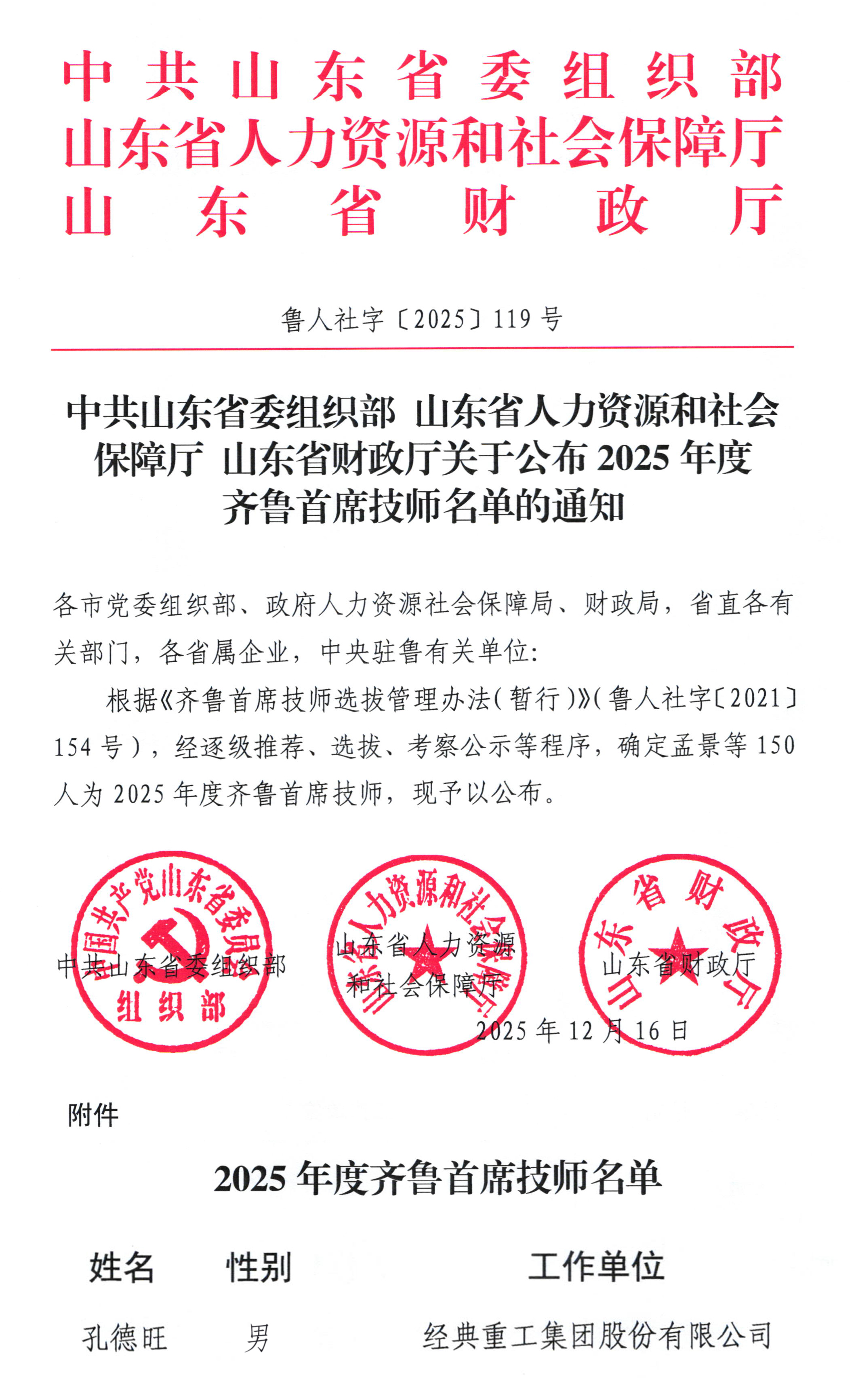 近日,山東省人力資源和社會(huì)保障廳正式公布 2025 年齊魯首席技師名單,優(yōu)秀共產(chǎn)黨員、高級(jí)技師孔德旺榮耀入選,經(jīng)典工匠再度獲得省級(jí)技能領(lǐng)域這一重磅殊榮,彰顯了企業(yè)人才培育的深厚積淀與卓越成效。