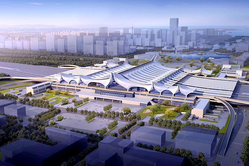 青島紅島站站房設計為“一大兩小、中間大兩邊小”的浪花造型,主體為鋼筋混凝土混合框架結構,屋面結構為雙向鋼桁架結構,落客平臺單向預應力鋼筋混凝土梁板結構,站臺雨棚為無站臺柱大跨鋼框架結構。 總用鋼量將達4.2萬噸,最大鋼結構跨度長約62米,通過分段拼裝完成。