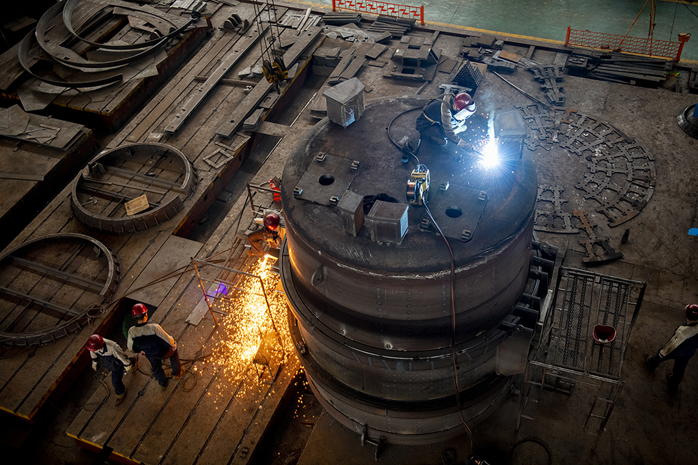 北方重工結(jié)構(gòu)件分廠工人在進(jìn)行焊接作業(yè)。(資料片)
